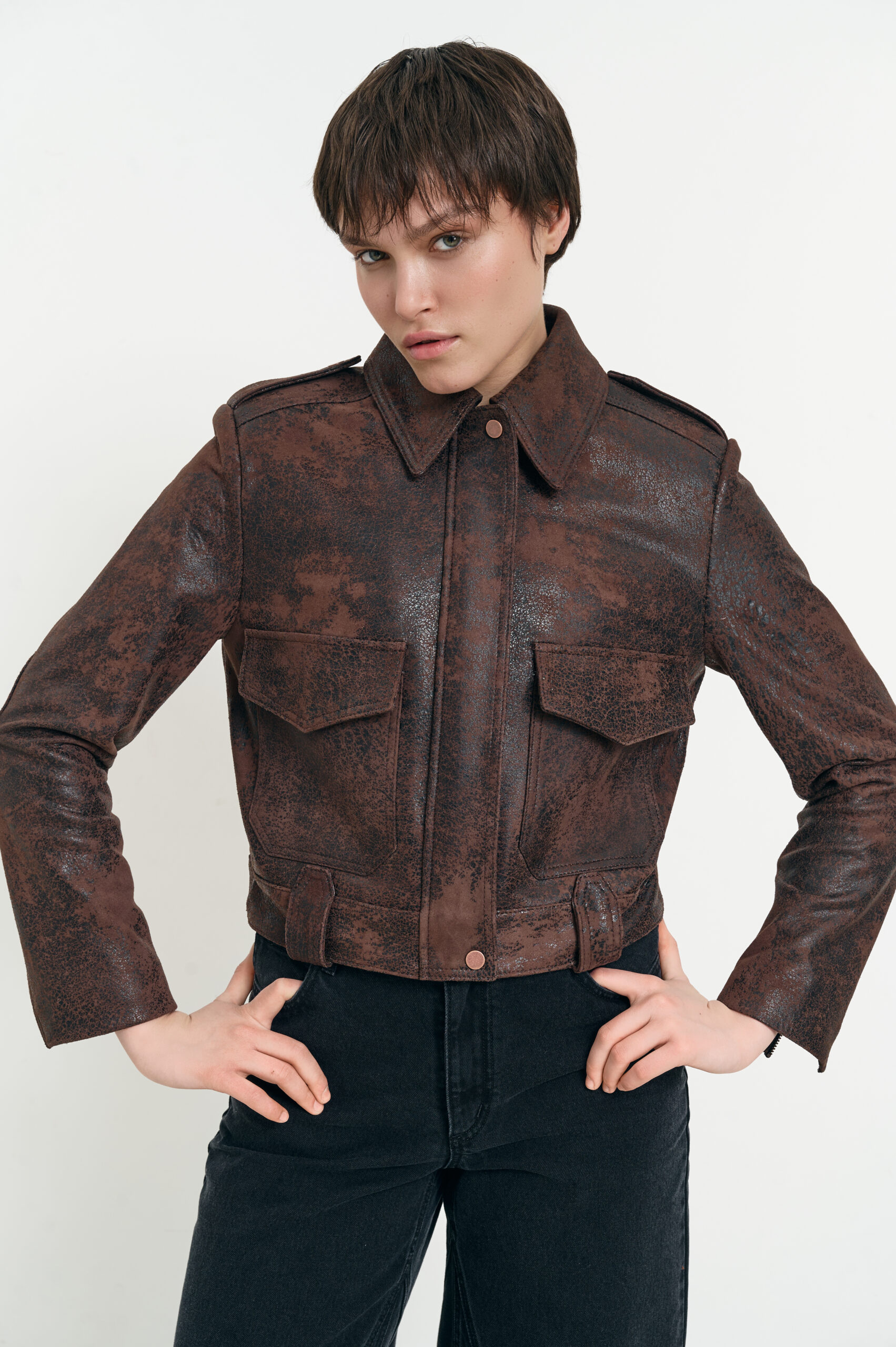 Укорочена куртка з натуральної шкіри з фактурним вінтажним ефектом. Архітектурний силует, чітка лінія плеча та структурована посадка створюють сильний, впевнений образ.
